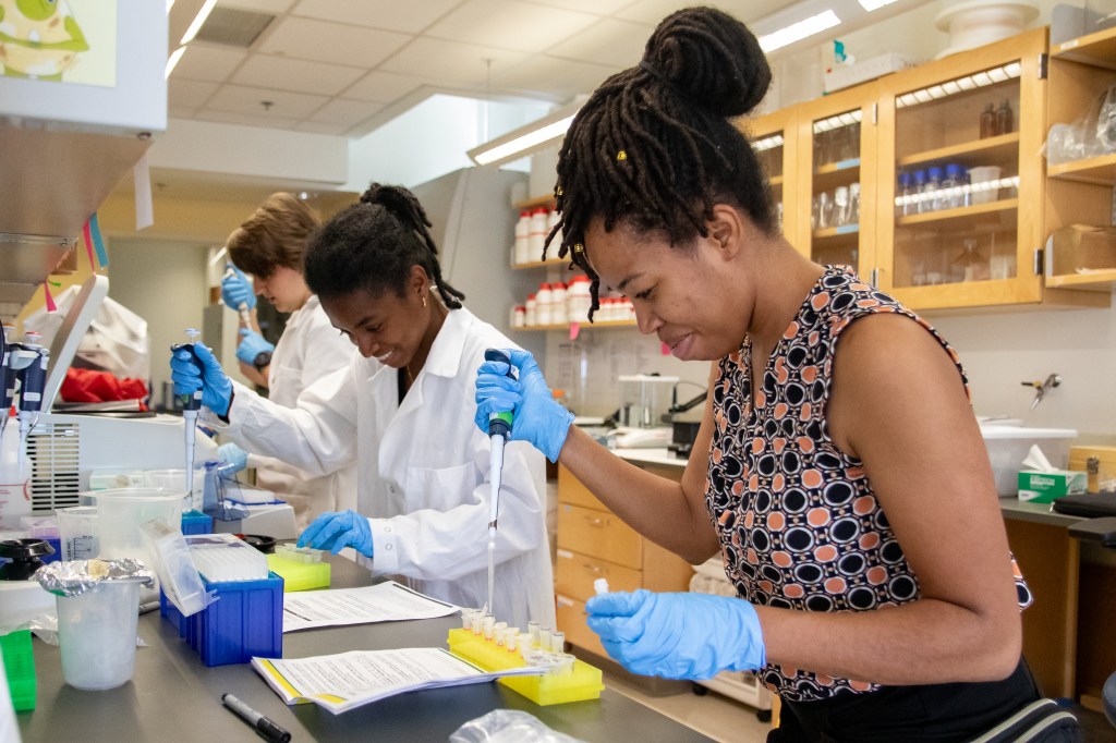 Nicole Lynn-Bell (right) training undergraduate researchers to process DNA samples for sequencing. Photo credit: Lisa Coe.