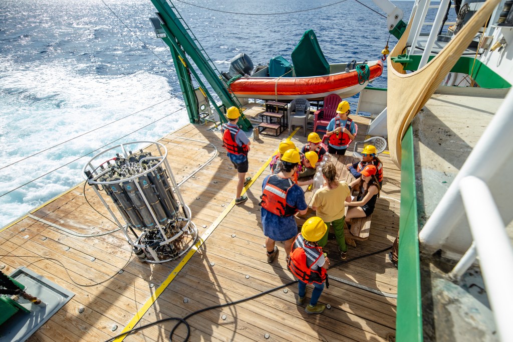 Researchers and students on the back deck of the Research Vessel Walton Smith during the “Microbial Life in the Oceans” Immersion course. Photo credit: Lisa Coe.