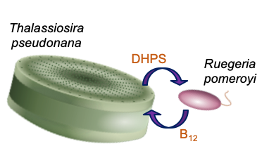 In a two-member model system between the diatom T. pseudonana and the bacterium R. pomeroyi, transcript and metabolite patterns reveal exchange of the diatom-derived sulfonate DHPS (dihydroxypropane sulfonate).